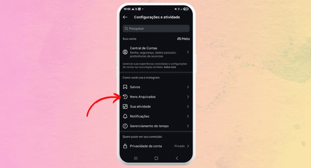 Na seção de “Configurações e Atividade”, procure a opção de “Itens arquivados” e clique nela para seguir para o próximo passo.